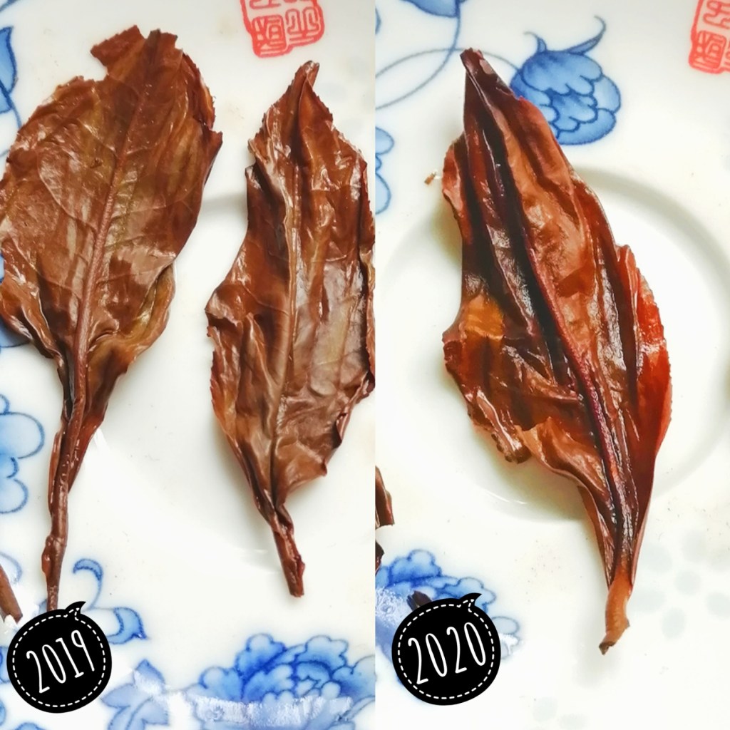 In terms of the change in leaf size after steeping there wasn’t too many differences really. The leaves of the 2019 harvest were a little more broken, not that they were small, but the larger leaves were cut almost in half and were missing the tops. There was some larger full leaves in there though that were a reddish brownish copperish colour with some light greeny/yellow patches in some places. The leaves in the 2020 harvest were around the same size as the full leaves in the 2019 but there were many more full & large leaves in the gaiwan after my steeping with the 2020 harvest and not as many broken/halved leaves in there. Colour wise they were pretty much the same in colour down to the greeny/yellow patches in some places.