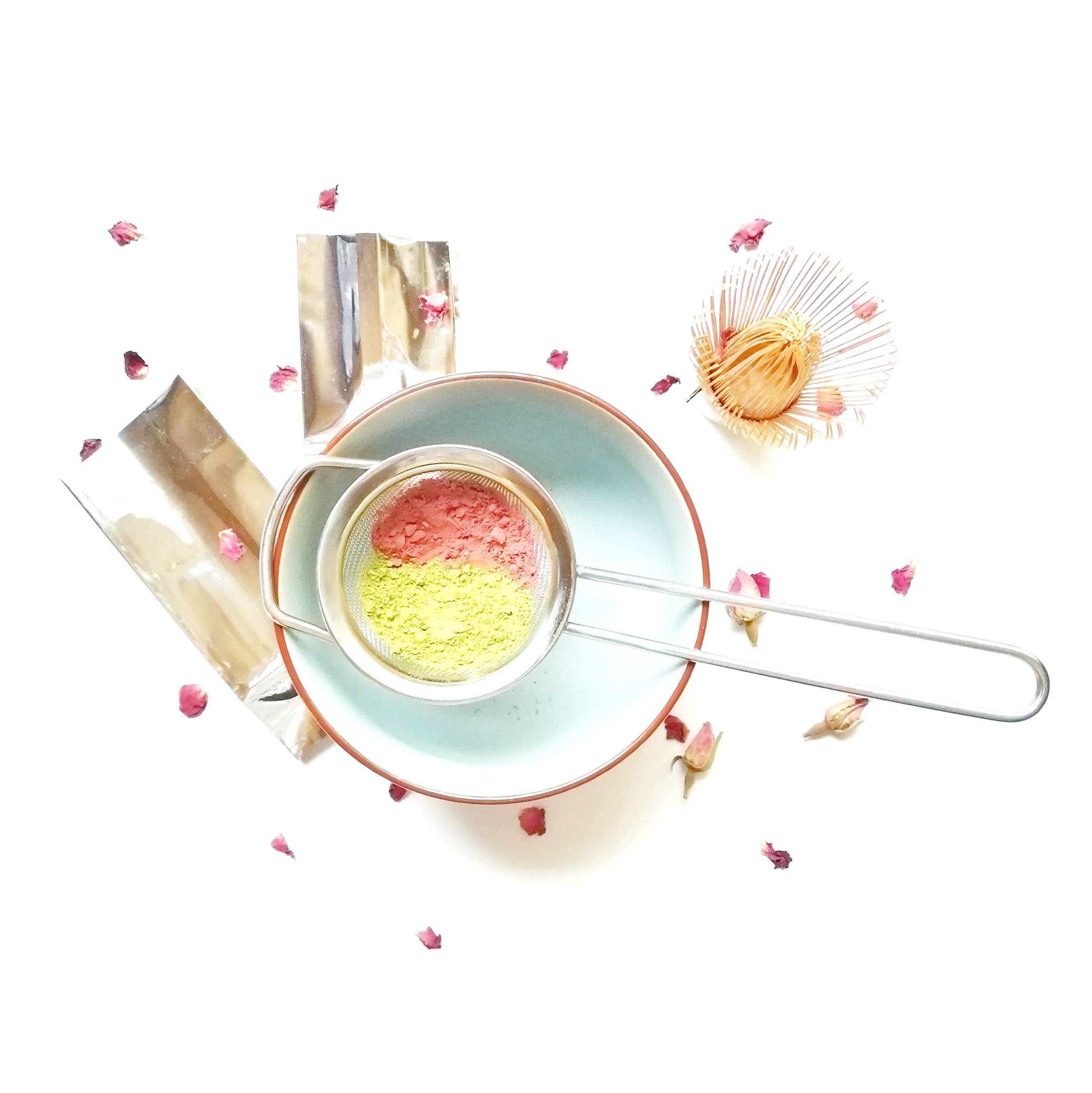 Basically, to create this rose matcha all you have to do is take 1-2 scoops of the Fujian Matcha (depending on how strong you want that to be) and then two scoops of the Empress Rose Powder and sieve them into your chawan (this will result in a smoother bowl of matcha overall).