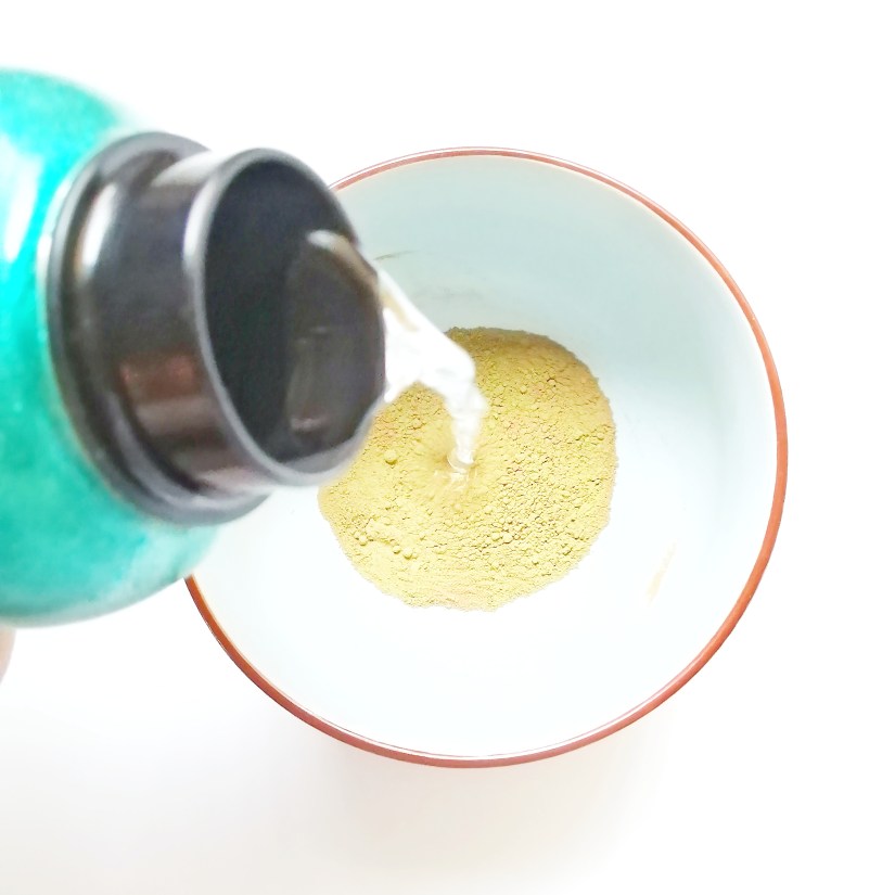 Once you have combined the two powders in your bowl, add in around 30-40ml of water. Then, take your whisk and combine the water and the matchas together to create a thick frothy, somewhat frothy paste. You don’t have to do this step but I always find it results in a much smoother bowl of matcha without any lumps at all just in case the sieve misses anything. Once you’ve done that you can add the desired amount of water you want to add so the strength is to your taste.