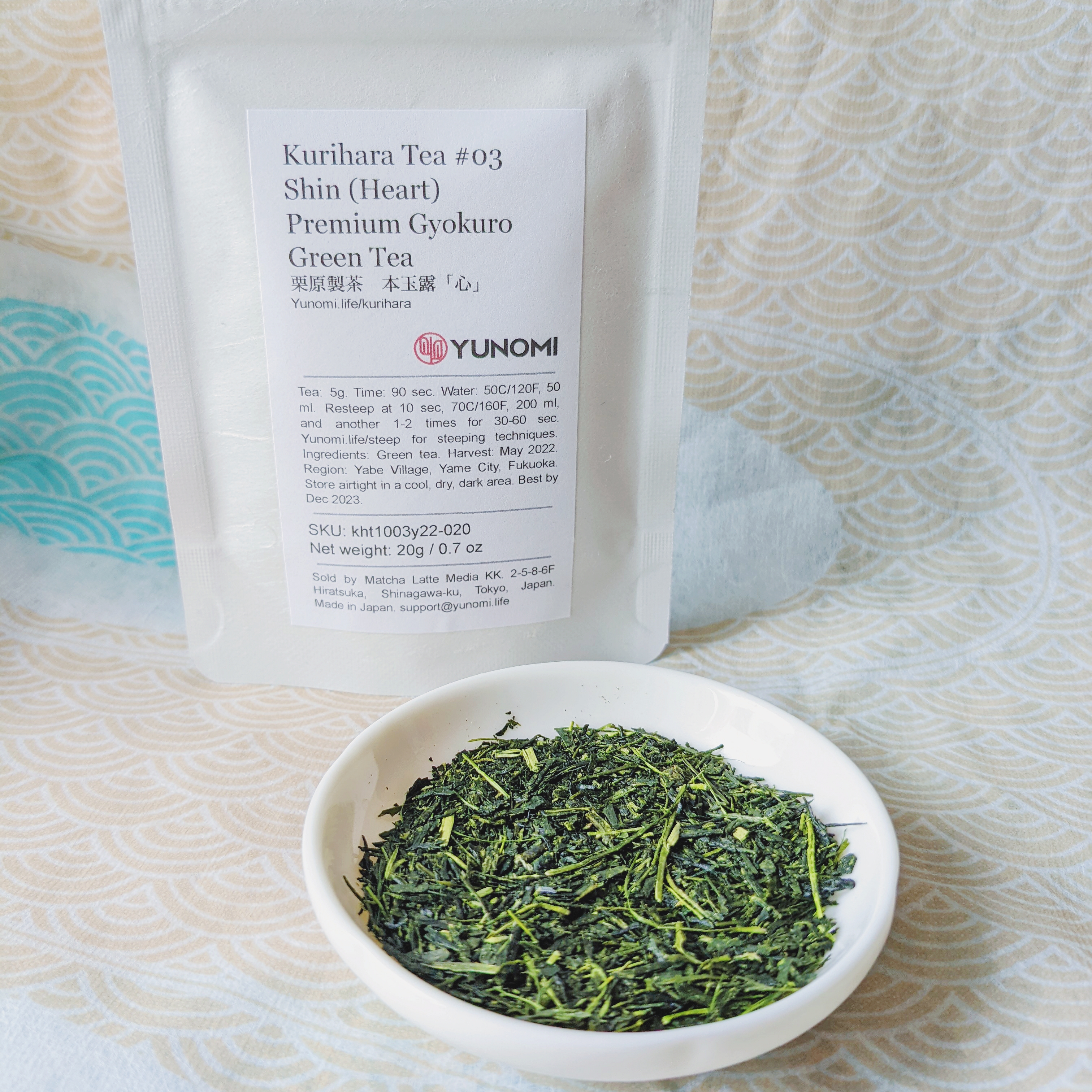Not too long ago now, I had the opportunity to try Kurihara Tea’s – #03 Shin (Heart) Premium Gyokuro and I thoroughly enjoyed the session, so I thought I’d share my notes with all of you. This particular Gyokuro is shaded for three weeks, machine cut and given a medium steaming. However, due to the leaves being young and delicate, the result of that steaming is much closer to a deep steamed Fukamushi tea.