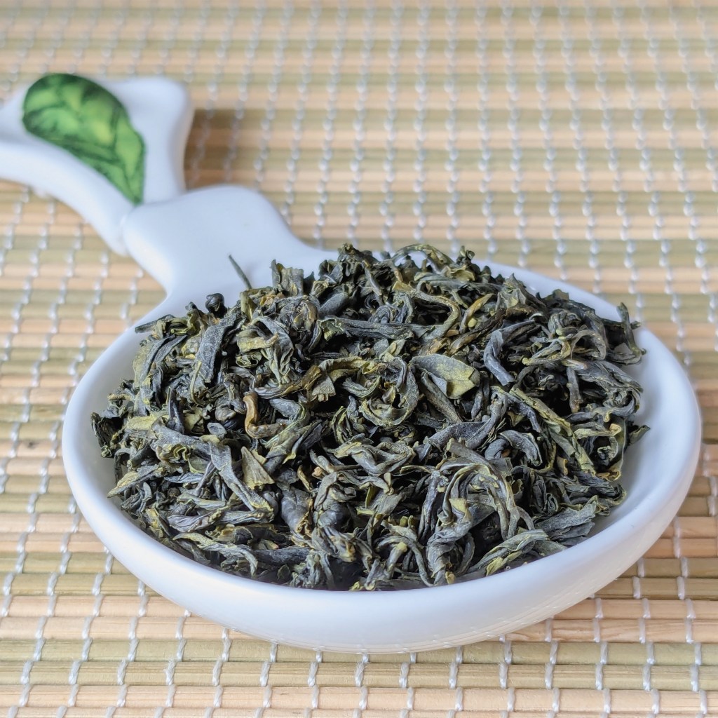 The dry leaves of this tea range in size from small to medium, they are a mixed palette of greens from dark bottle green to light bright green. Some of them are straight, while others are rolled and slightly curled, all of them matte in texture.